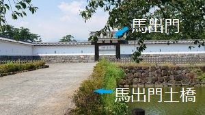 馬出門は三の丸から二の丸へと通じる重要な門で、控柱に屋根のつく『高麗門』という形式の門で平成21年に再現したものです。