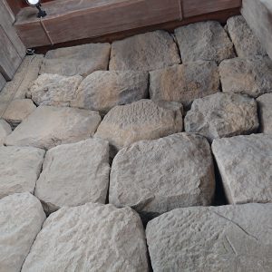 橋台の石積みと松丸太の橋脚が立った状態で発掘された住吉橋。