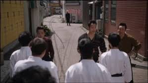 真ん中の黒のVネックを着た人物ですが、セリフは「来いよ やんのか?」の一言で、約10秒程。背が高く恰幅がいいので一見強そうですが、白い道場着の一団にノックアウトされてしまいます。
