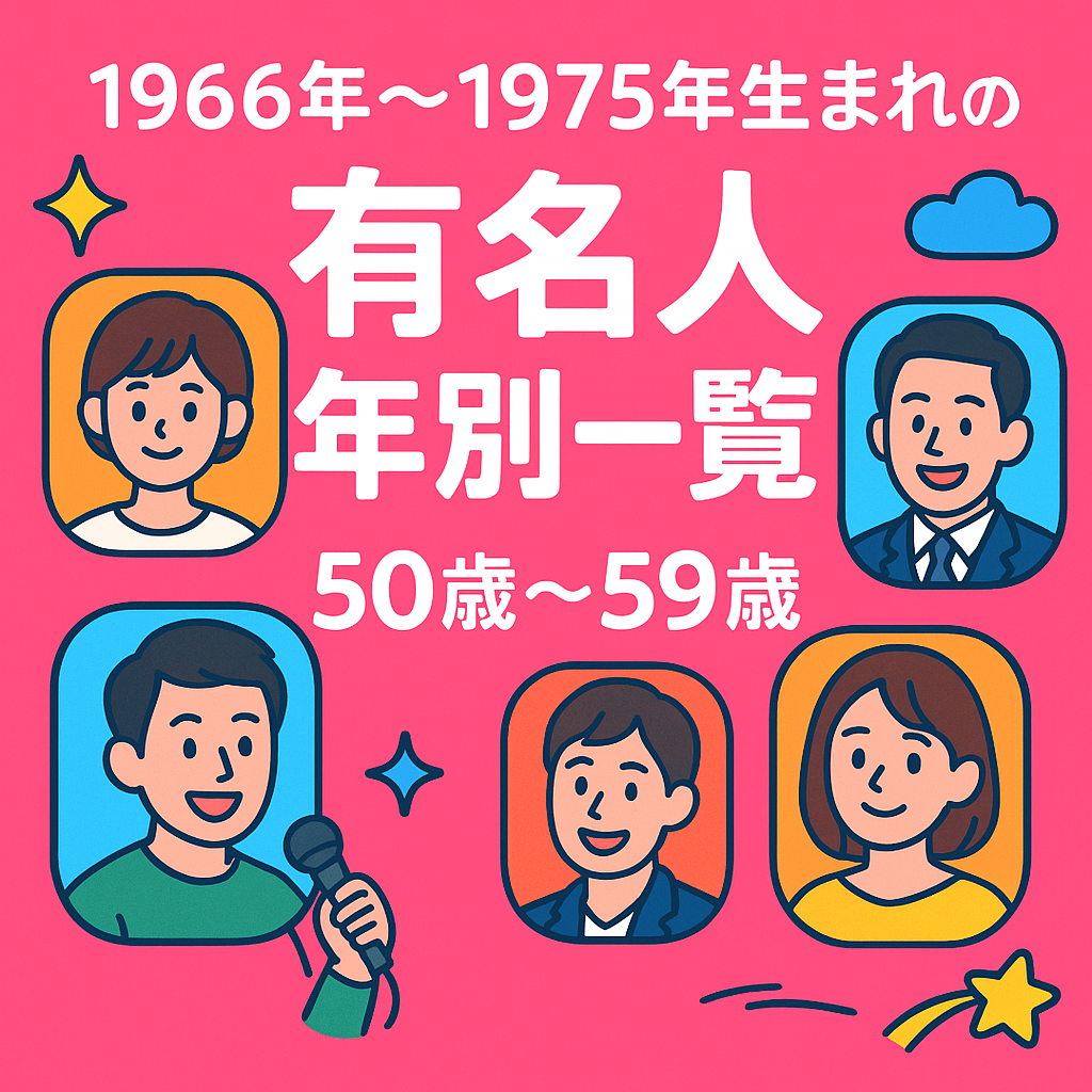 2025年7月11日現在、50歳から59歳までの、芸能界やスポーツ界で活躍する有名人を「生まれ年」ごとに一覧で紹介します。豊富な経験を積み、各分野の第一線で輝き続ける彼ら・彼女たちの顔ぶれを年別に整理することで、世代ごとの特徴や円熟味を増したスターたちの魅力を再発見できるでしょう。