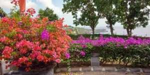 海の青と白い砂浜。葉っぱの緑とブーゲンビリアの赤。そして、赤いブーゲンビリアの向こうは青いインド洋!